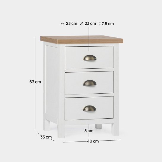 Il comodino bianco a 3 cassetti Marais è il pezzo perfetto per ottenere spazio di archiviazione extra e mantenere la tua camera da letto pulita e ordinata. Grazie al suo design semplice e senza tempo si adatta a qualsiasi stile decorativo. I suoi tre cassetti sono dotati di un sistema di chiusura con ritenuta che impedisce che si verifichino urti durante la chiusura e impedisce l'apertura involontaria. Combinalo con la cassettiera Marais e crea una camera da letto piena di fascino.