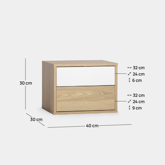 Comodino galleggiante con 2 cassetti in legno colore naturale e bianco