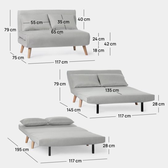 Il divano letto da 2 posti grigio Noa è l'ideale per qualsiasi camera da letto o soggiorno di dimensioni ridotte. Grazie al suo sistema di apertura clic clac, puoi trasformarlo in pochi secondi in un letto supplementare con capacità per due persone. Include due cuscini rettangolari con fodere rimovibili. È disponibile in diverse finiture in modo da poter scegliere quella che si adatta meglio al tuo stile.
