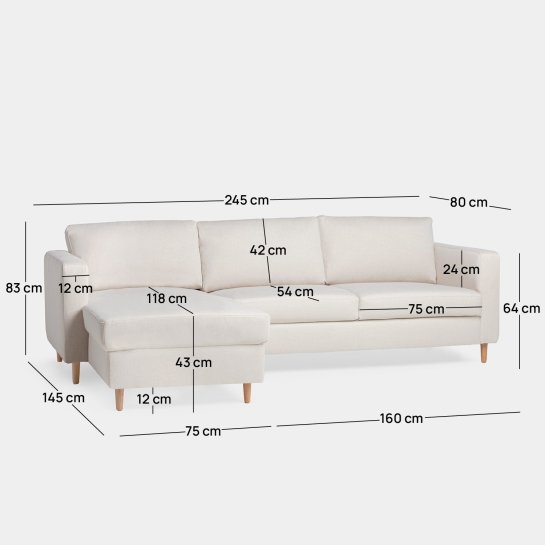 Il divano chaise longue da tre posti Beth è ideale e molto pratico. È reversibile, quindi puoi posizionare la chaise longue dove ti è più comodo. È un divano comodo e molto funzionale. È disponibile anche in grigio.