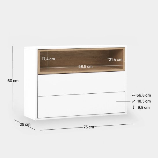 Trasforma l'ingresso della tua casa con il mobile d'ingresso sospeso Hazan, finito in legno bianco e naturale. Ha uno spazioso spazio di archiviazione con i suoi due cassetti e un vano superiore, ideale per avere a portata di mano gli oggetti essenziali. Combinalo con il resto della collezione per creare un ambiente armonioso.