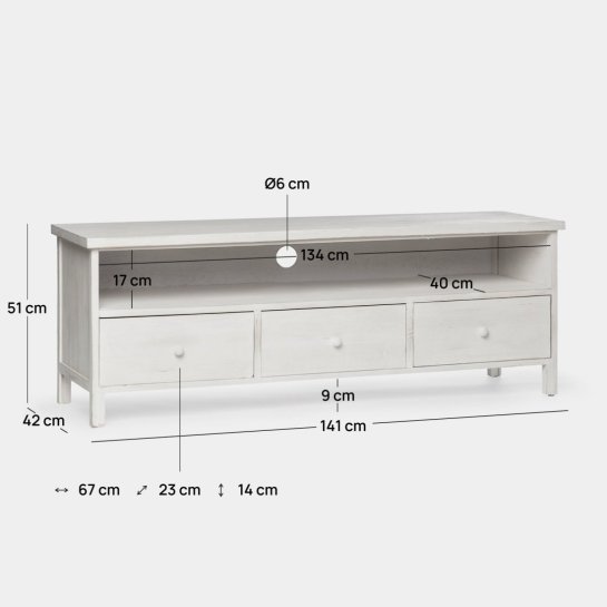 Il mobile TV Folk, realizzato in legno riciclato privo di trattamenti chimici, fonde la bellezza dello stile naturale con la sostenibilità del riciclaggio. Ogni pezzo, realizzato artigianalmente, racconta una storia unica attraverso le sue imperfezioni e conferisce carattere a qualsiasi ambiente. La sua ampia mensola e i suoi due cassetti permettono di riporre in modo ordinato gli accessori del televisore, combinando funzionalità e stile in modo armonioso. Il sistema di chiusura dei cassetti è senza guide.