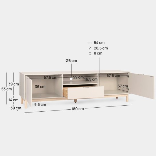 Il mobile TV laccato in bianco avorio Elian è perfetto per aggiungere un tocco nordico e accogliente alla tua casa. Le sue due porte, lo spazio vuoto e i cassetti ti offrono la possibilità di riporre i tuoi oggetti in modo ordinato e accessibile, mantenendo il tuo soggiorno pulito e organizzato. Combinalo con altri mobili della collezione per ottenere un look completo e armonioso.