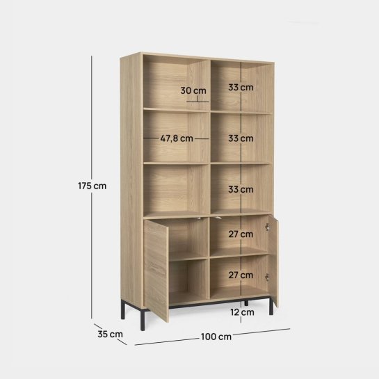 Trasformate qualsiasi spazio della vostra casa con la libreria alta Remi, rifinita in legno naturale e gambe in metallo nero. Le sue ante e i suoi ripiani offrono un ampio spazio per organizzare in modo ordinato tutti i libri, gli oggetti personali e gli accessori, mantenendo alcuni elementi visibili e altri nascosti. Abbinatela ad altri pezzi della collezione per creare un ambiente elegante e pratico.
