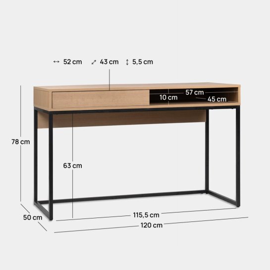 La scrivania Aidan in legno naturale con gamba metallica nera porterà funzionalità e stile alla stanza di tuo figlio. Dotata di un cassetto e di uno spazio superiore, offre un'organizzazione perfetta per il suo materiale scolastico. Aidan unisce calore e freschezza in un design che potenzierà la sua concentrazione e creatività con totale comodità. È disponibile in più finiture, per permetterti di scegliere quella che preferisci.