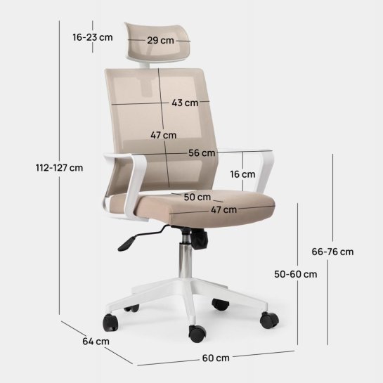 Con la sedia da scrivania Leima in beige potrai creare uno spazio di lavoro comodo e salutare. Si tratta di una sedia ergonomica che ti consentirà di lavorare comodamente per molte ore. È dotata di supporto lombare, poggiatesta, braccioli, seduta regolabile in altezza e ruote girevoli.