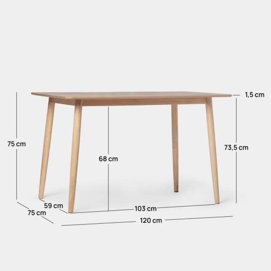 Tavolo da pranzo rettangolare 120x75 in impiallacciatura di frassino e legno di hevea colore naturale