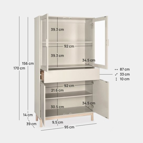 Aggiungi un tocco di stile a qualsiasi spazio con la vetrina laccata in bianco avorio Elian. Le sue due ampie porte in vetro ti permetteranno di esporre la tua migliore porcellana e oggetti decorativi con eleganza, mentre il suo cassetto e le due porte inferiori offrono uno spazio di archiviazione discreto per tutto ciò che preferisci tenere fuori dalla vista. Combinala con altri mobili della collezione e ottieni uno spazio armonioso e accogliente.
