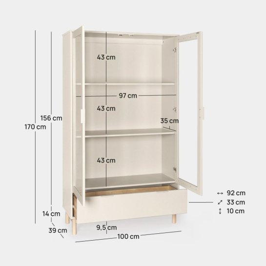 Completa l'arredamento del tuo salotto con la vetrina laccata in bianco avorio Elian. Le sue due porte in vetro permettono di esporre e conservare la tua biancheria per la casa mentre la proteggono dalla polvere. Inoltre, il suo cassetto inferiore offre uno spazio aggiuntivo perfetto per riporre tovaglie o altri tessili per la casa. Combinala con altri mobili della collezione e ottieni uno spazio armonioso e accogliente.