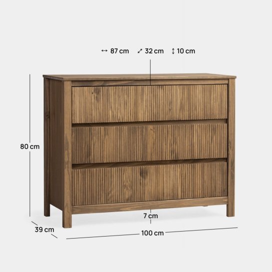 Geef je slaapkamer een make-over met de Hanne-ladekast met 3 lades, gemaakt van massief hout met een walnootkleurige afwerking. Het eigentijdse ontwerp combineert strakke lijnen met de warmte van hout, waardoor een verfijnd en functioneel meubelstuk ontstaat. De tekeningen die de nerven vormen, geven textuur en persoonlijkheid, waardoor elk meubelstuk uniek en bijzonder is. Combineer het met de rest van de collectie om uw kamer warmte en elegantie te geven.