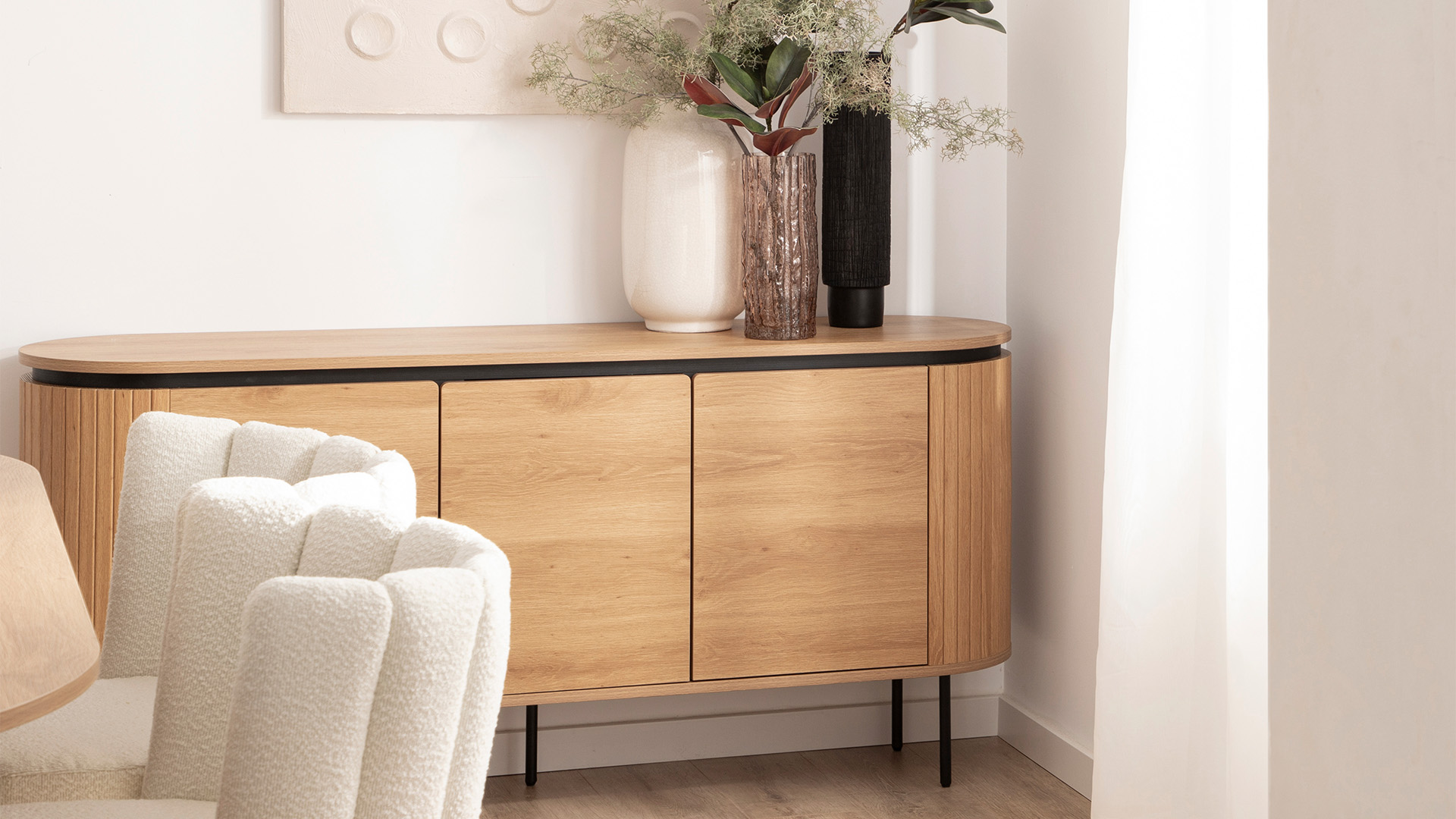 De Helios dressoir in natuurlijk hout combineert elegantie en functionaliteit met zijn ontwerp van zachte lijnen en ronde vorm. De drie deuren verbergen een ruime interne opbergruimte, perfect om alles georganiseerd en binnen handbereik te houden. Ideaal voor elke kamer, dit dressoir integreert perfect met de rest van de collectie voor een harmonieuze en stijlvolle uitstraling.