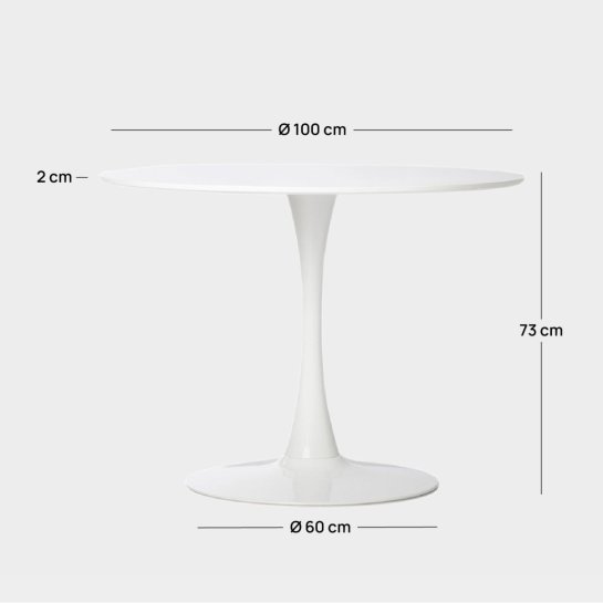 De retro-rondingen, strakke lijnen en witte afwerking zorgen voor licht en ruimtelijkheid. Dankzij de centrale tulpvormige poot passen alle stoelen er gemakkelijk onder. Deze is geschikt voor 4 mensen, dus je kunt deze gebruiken en delen met gezinsleden en vrienden in je eetkamer, in de keuken, in je bar of restaurant of zelfs op je kantoor, als ronde vergadertafel. Het kleinere formaat maakt dit een veelzijdig stuk.