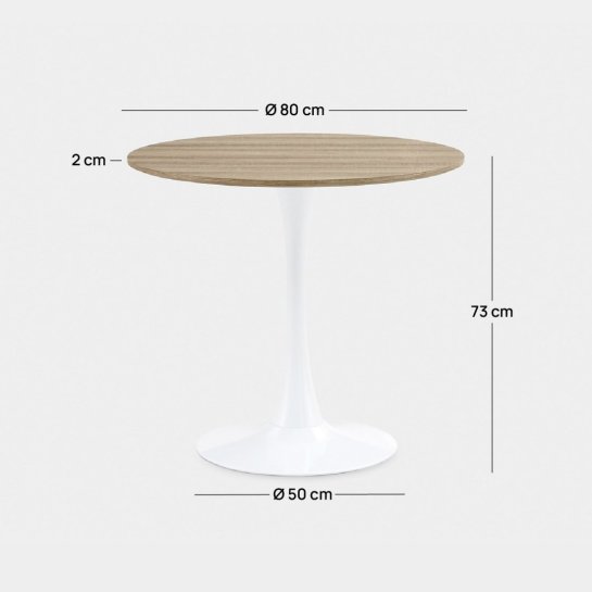 De ronde eettafel Cory is een combinatie van vintage betovering en een modern en verfijnd design. Het blad met een natuurlijke houtkleur en de retro-rondingen zorgen voor een breed en licht effect in elke omgeving. Dankzij de tulpvormige centrale poot wordt het eenvoudig om 4 stoelen eronder te schuiven. Deze tafel is dus de ideale keuze voor de eetkamer, de keuken of een bar of restaurant. De compacte afmetingen bieden veel veelzijdigheid.