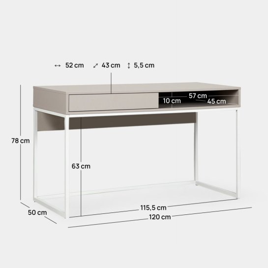 Het Aidan bureau in parelgrijs hout met wit metalen poot zal functionaliteit en stijl toevoegen aan de kamer van je kind. Uitgerust met een lade en een bovenste vak, biedt het perfecte organisatie voor hun schoolmateriaal. Aidan combineert warmte en frisheid in een ontwerp dat hun concentratie en creativiteit zal versterken met totale comfort. Het is verkrijgbaar in meer afwerkingen, zodat je kunt kiezen welke je het leukst vindt.