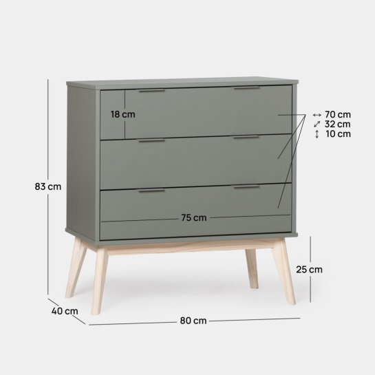 Houd de kamer van je kleintje altijd opgeruimd met de kinderkast Troy. De drie ruime laden bieden veel opbergruimte, ideaal voor het opbergen van kleding, speelgoed en accessoires, waardoor alles georganiseerd en uit het zicht blijft. Voor extra stabiliteit raden we aan om het aan de muur te bevestigen. Het is ook verkrijgbaar in het wit. Combineer het met de rest van de collectie Troy en creëer een praktische en gezellige ruimte.