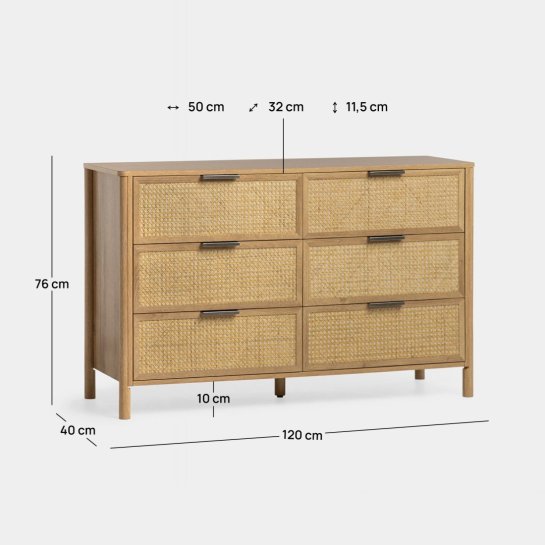 Kindercommode met 6 lades in naturelkleurig hout en naturel rattan