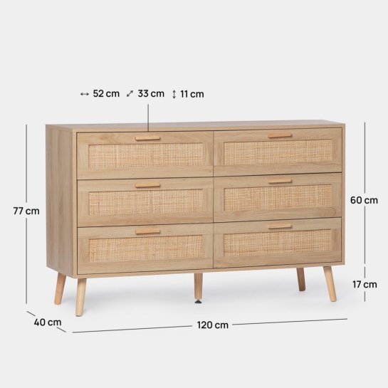 Commode met 6 lades met natuurlijke houtkleur en natuurlijk rotan