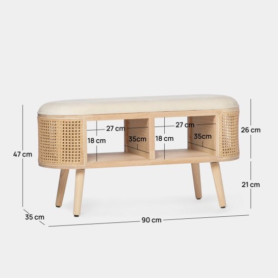 Maak je woning mooier met de bank Chela, bekleed met beige fluweel en met details gemaakt van natuurlijk rotan. Deze combinatie maakt elke omgeving knus. Dit meubelstuk is veelzijdig en elegant en is ideaal voor aan het voeteneinde van je bed of als extra zitplek in de woonkamer. Bovendien beschikt deze bank over twee inkepingen in het midden voor schoenen, zodat je deze altijd bij de hand hebt.