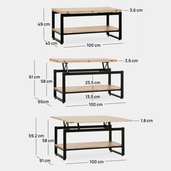 De Alvi in hoogte verstelbare en uitschuifbare salontafel heeft 3 verschillende posities die optimaal gebruik van de ruimte in de woonkamer mogelijk maken. Het uitschuifbare eikenhouten blad kan in enkele seconden worden uitgebreid tot een bruikbaar oppervlak van 90x100 cm, waardoor het ideaal is om te eten of te werken op de computer vanaf de bank. Het eikenhouten blad kan lichte kleurvariaties vertonen ten opzichte van wat er op de afbeelding wordt getoond.