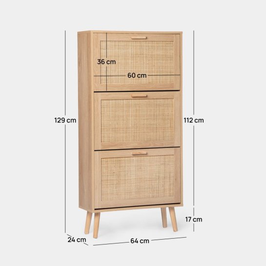Houd je schoenen geordend en toegankelijk met het smalle schoenenrek Tahiti, gemaakt van natuurlijk rotan. De drie deuren met scharnieren bieden royale opbergruimte voor wel 15 paar schoenen, zodat je je favoriete paar altijd bij de hand hebt. Bovendien beschikt elke container over een verwijderbare scheiding, zodat je de ruimte eenvoudig kunt aanpassen voor het opbergen van grotere schoenen. Dit schoenenrek is een perfecte combinatie van functionaliteit en stijl en mag dus niet ontbreken in je woning.