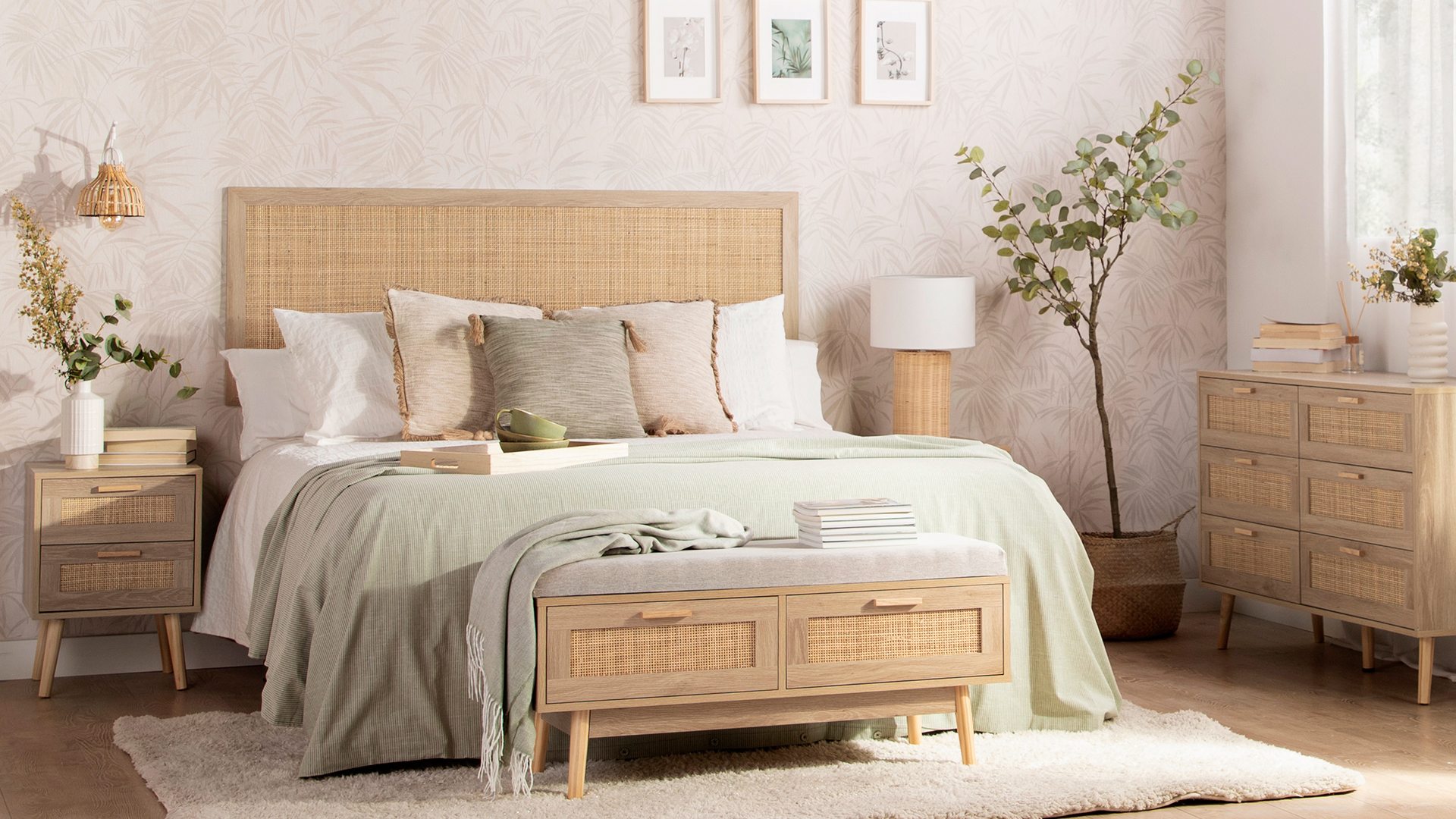 Smal schoenenrek met natuurlijke houtkleur en natuurlijk rotan