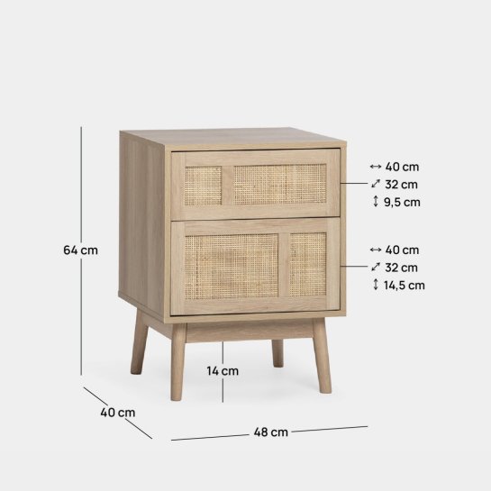 Set van 2 nachtkastjes met 2 laden in hout naturel en rotan naturel