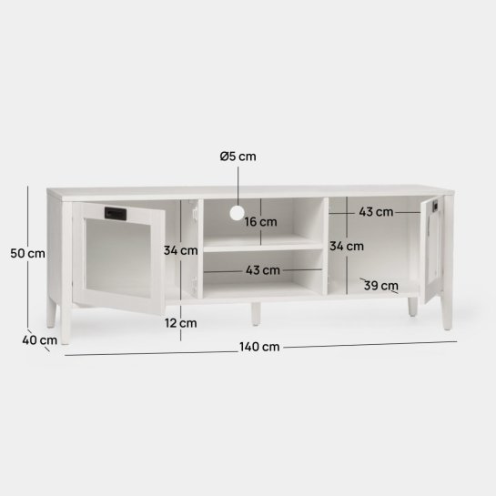 Geef je woonkamer een elegant en verfijnd tintje met het witte tv-meubel Edan van 140 cm, gemaakt van berken- en grenenfineer. Het beschikt over twee glazen deurtjes en twee planken, zodat je al je multimedia-accessoires kunt uitstallen of opbergen en je woning opgeruimd kunt houden. Het is ook beschikbaar in andere afwerkingen. Kies degene die je het mooist vindt.