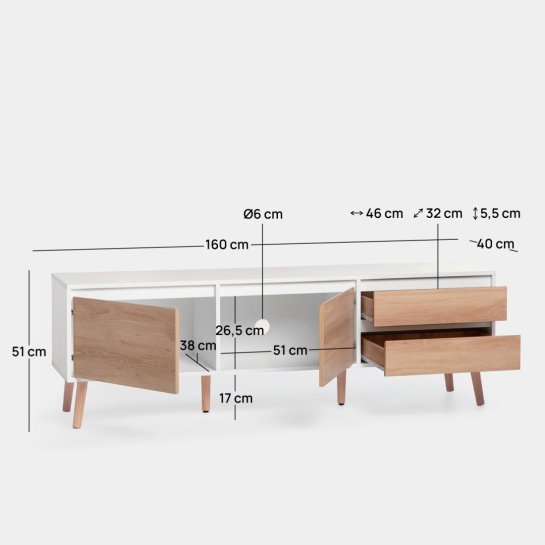 Geef je huis een frisse en lichte touch met de TV 160 Kemi meubel, afgewerkt in wit en natuurlijk hout. Het Scandinavische ontwerp en de eenvoudige lijnen maken het de ideale keuze om een gezellige en harmonieuze sfeer te creëren in je woonkamer. De ruime compartimenten bieden de perfecte ruimte om al je apparaten en accessoires georganiseerd en verborgen te houden. Ontdek de rest van de Kemi collectie en creëer een evenwichtige en stijlvolle inrichting.