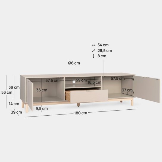 De gelakte TV-meubel in parelgrijs Elian is perfect om een Scandinavische en gezellige touch aan je huis toe te voegen. De twee deuren, ruimte en laden bieden je de mogelijkheid om je spullen op een geordende en toegankelijke manier op te bergen, waardoor je woonkamer schoon en georganiseerd blijft. Combineer het met andere meubels uit de collectie voor een complete en harmonieuze uitstraling.