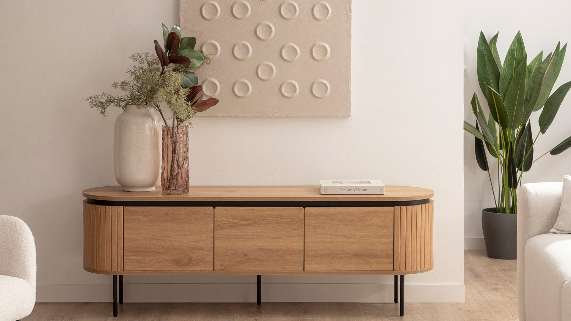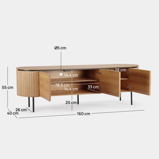 De TV-meubel Helios in natuurlijk hout combineert elegantie en functionaliteit in een ontwerp met zachte lijnen en een ronde vorm. De deuren met afgeronde randen benadrukken niet alleen de stijl, maar bieden ook gemakkelijke toegang tot de ruime opbergruimte. Combineer het met de rest van de collectie voor een harmonieuze en stijlvolle uitstraling.