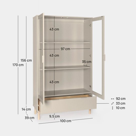 Maak de inrichting van je woonkamer compleet met de gelakte vitrinekast in parelgrijs Elian. De twee glazen deuren stellen je in staat om je huishoudelijke spullen tentoon te stellen en op te bergen terwijl ze beschermd worden tegen stof. Daarnaast biedt de onderste lade extra ruimte om tafellinnen en andere huishoudtextiel op te bergen. Combineer het met andere meubels uit de collectie en creëer een harmonieuze en gezellige ruimte.