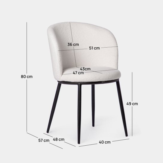 A cadeira de jantar Nolan estofada em bouclé cor branco com pernas metálicas pretas é a peça ideal para completar a decoração da sua casa. O seu encosto curvo envolve perfeitamente as costas e proporciona uma grande sensação de conforto e comodidade. O seu estofamento em pele de carneiro exala tendência e estilo.