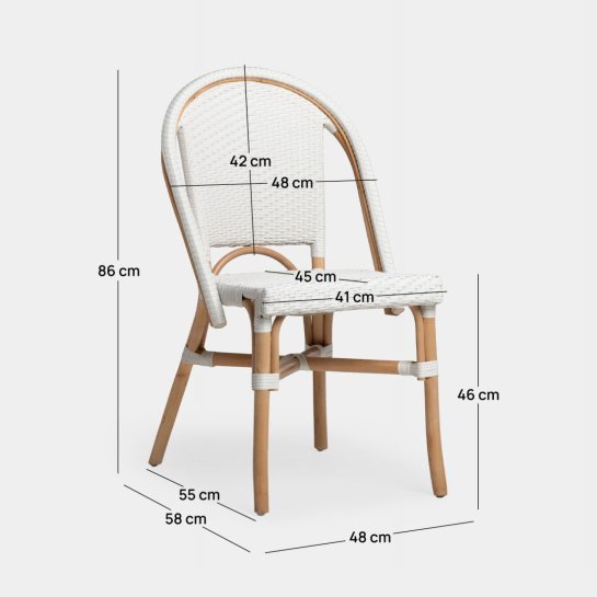 A cadeira Dine em rattan com detalhes em branco é a escolha perfeita para adicionar personalidade e sofisticação a qualquer espaço. O seu design de formas curvas combina a naturalidade do rattan com elegantes toques de branco, criando uma peça cheia de caráter e estilo. Esta cadeira versátil oferece conforto e uma estética distinta que realça qualquer ambiente decorativo. É recomendável protegê-la de condições meteorológicas adversas para garantir a sua durabilidade. Está disponível em três acabamentos diferentes para que possa combiná-los como mais lhe agradar.